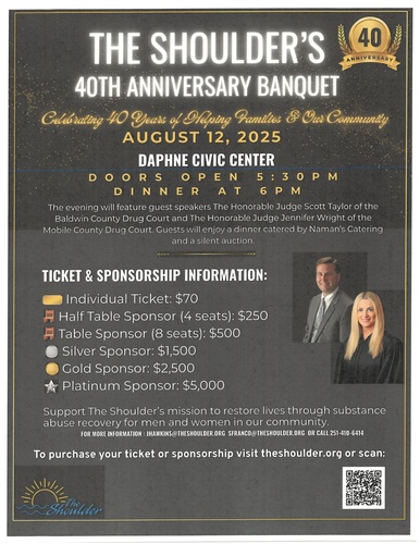 The Shoulder is celebrating 40 years of helping families in our community. Please come show your support for The Shoulder's mission is to restore lives through substance abuse recovery for men and women.
